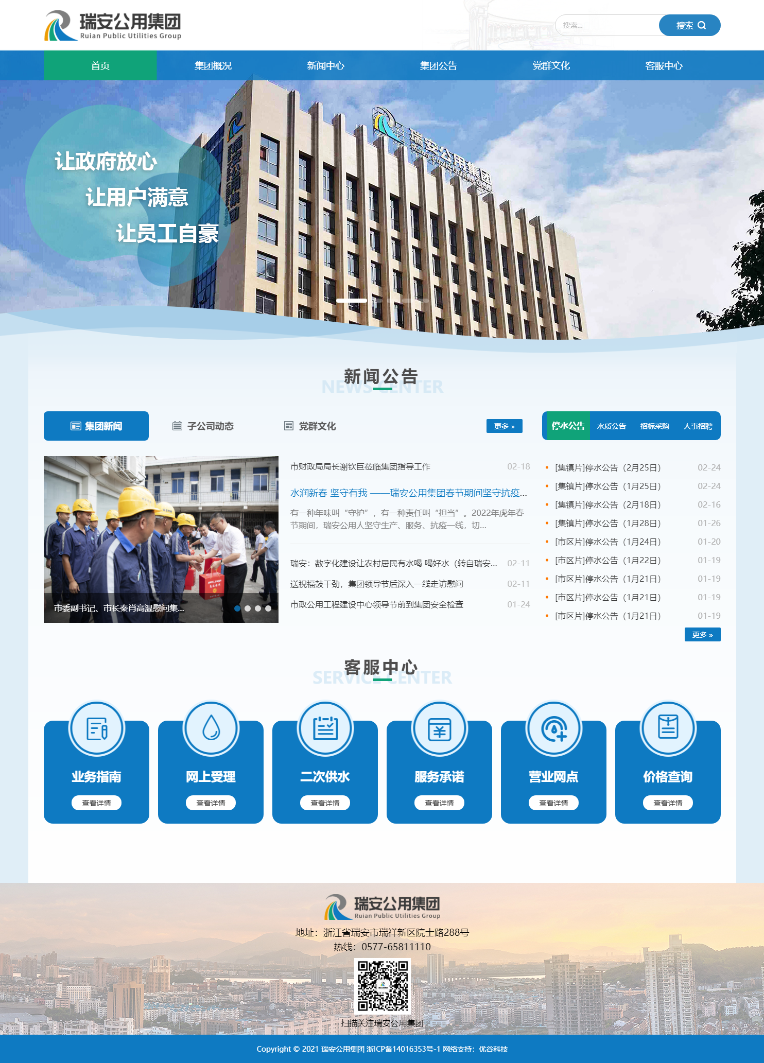 瑞安市公用事業(yè)投資集團(tuán)有限公司秉承“讓政府放心、讓用戶滿意、讓員工自豪”的企業(yè)宗旨,以保障社會(huì)民生為中心任務(wù),推進(jìn)城市給排水一體化運(yùn)作,規(guī)范天然氣供氣市場(chǎng),有效整合我市水務(wù)、燃?xì)?、污水收集與處理、排水設(shè)施建設(shè)運(yùn)營(yíng)等公用事業(yè)資產(chǎn),有效提高公用事業(yè)資源集成效率和資本運(yùn)作能力,推進(jìn)各項(xiàng)公用事業(yè)基礎(chǔ)設(shè)施的投融資和建設(shè)任務(wù),著力建設(shè)“供水網(wǎng)、排水網(wǎng)、供氣網(wǎng)”三張網(wǎng),打造集投資、建設(shè)、運(yùn)營(yíng)于一體的公用建設(shè)管理體系,為打造品質(zhì)之城、建設(shè)幸福瑞安作出更大貢獻(xiàn)。